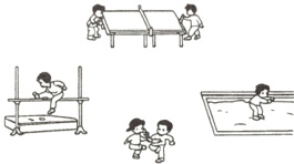 跳高器材在操场的( )面,跳远沙坑在操场的( )面,乒乓球桌在操场的( )面,踢毽子的同学在操场的( )面。
