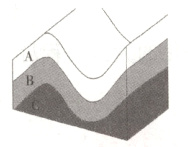 14. 如图所示某地三个岩层A、B、C中均发现了许多生物化石,请分析回答: