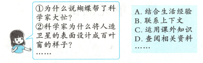 3. ① B 科学家根据蝴蝶身上的鳞片可以调节体温的原理,将人造卫星表面设计成百叶窗的样子,人造卫星表面的温度差大大减小。蝴蝶和人造卫星之间会有什么关系呢?