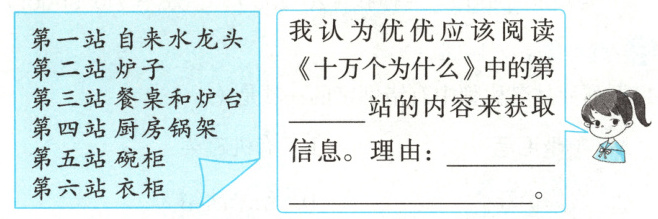 我认为优优应该阅读《十万个为什么》中的第______站的内容来获取信息。理由:______________________________。