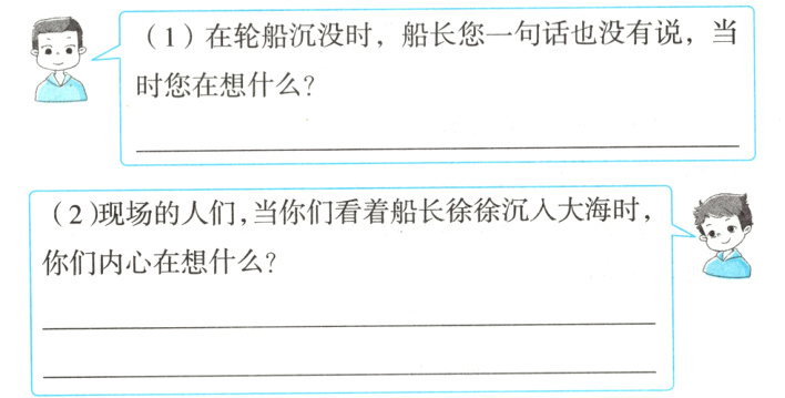 5.(1)船上的所有乘客都已安全撤离,那我就放心了。 (2)哈尔威船长真是一位忠于职守的好船长,他救了我们,却牺牲了自己的生命,我们会永远怀念他。