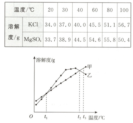 (2)海水中还含有KCl和MgSO₄等物质,其在不同温度时的溶解度如下表所示,如图是对应的溶解度曲线。