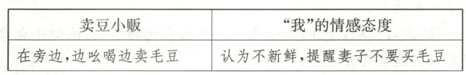 7. [梳理概括]请从“卖豆小贩”的角度概括情节,并梳理出“我”的情感态度,补全下面的表格。(6分)