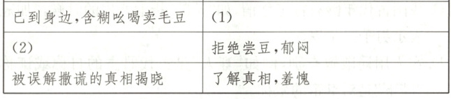 [解析](1)结合表格中的“卖豆小贩已到身边,含糊吆喝卖毛豆”可以快速定位到第⑪段,根据第⑪段“吆喝从这胡子下跑出来,加重了这种虚假感。这让我更加坚定了不买的念头”,第⑮段“真的,笼底还有一些毛豆,绝不止一碟”,第⑰段“这么明显的谎话,也只有他相信吧”等内容可知,“我”认为卖豆小贩撒谎,坚定不买。(2)结合表格中的上一个情节“卖豆小贩已到身边,含糊吆喝卖毛豆”,表格中的“拒绝尝豆,郁闷”和第㉓段“我拒绝。这顿夜宵因为这碟毛豆而有些郁闷”可知,这部分情节在第⑲~㉓段,根据第㉑段“妻子尝了一粒毛豆,说:‘很鲜的。来一碟。’我还没来得及阻拦,她已经扫码付了钱。男人给妻子鞠个躬,腿一拉一拉地走了”可知,这部分情节可概括为:向买豆的妻子鞠躬。