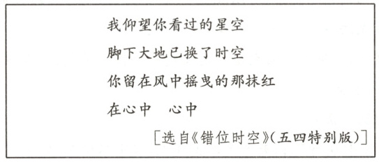 [解析]根据歌词“我仰望你看过的星空”可知,“我”指生活在和平年代的我们,“你”指为了今天的幸福生活而献出生命的革命先烈,歌词首句与标题中的“彼此”相呼应;歌词“脚下大地已换了时空”与文章第⑤段“现在,景色不一样了。对面已换成高大的牌楼,牌楼上四个大字:烈士陵园。字是金色的,四周是一种浅浅的蓝,透着淡淡的忧伤”呼应,昔日的战场已经变成烈士陵园,脚下的大地已经变换了时空,体现了后代对先烈的守望;歌词内容“你留在风中摇曳的那抹红/在心中”和本文都表达了后代对革命先烈的缅怀、崇敬和赞美之情。
