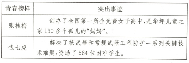 (4)通过阅读,你认识了许多杰出人物。学校将举行“致敬楷模,青春榜样”活动。请从下面两位当代杰出人物中选择一位作为你的青春榜样,并说明选择理由。要求:结合所选人物的突出事迹和品质,至少运用一种修辞手法,语言有感染力,不超过50字,不得使用所给材料中的语句。(4分)