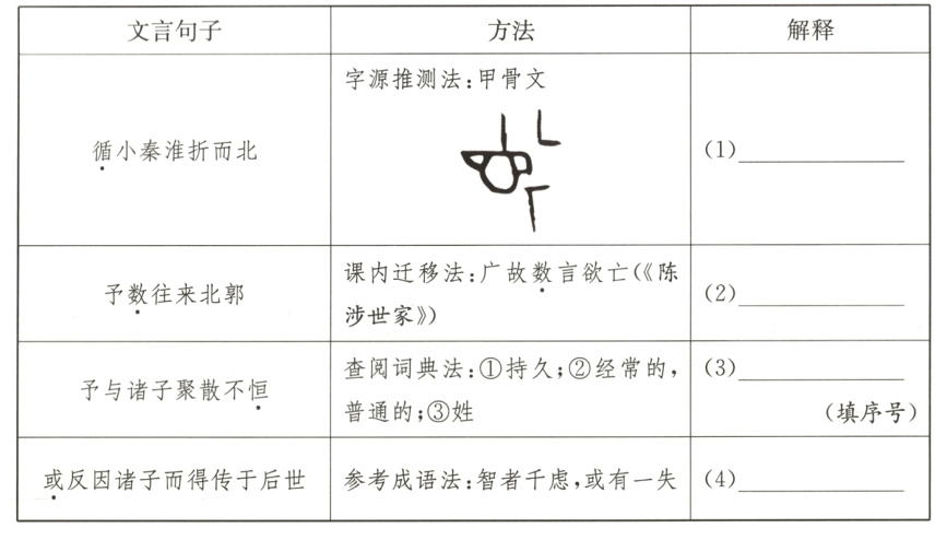 [解析](1)结合甲骨文字形分析,“循”的甲骨文字形像是一只眼睛沿着道路巡视,根据字源推测法可知,“循”是“沿着,顺着”的意思。句意:沿着小秦淮河转向北。(2)“广故数言欲亡”意为:吴广故意屡次说想逃跑。数,屡次。代入句中合适,故“予数往来北郭”意为:我屡次往来城北。(3)将词典中的各个义项分别代入句子分析可知,“恒”是持久的意思。(4)成语“智者千虑,或有一失”的意思是聪明人对问题深思熟虑,或许也会出现差错。或,或许。代入句中合适,句意为:或许反而会因我们几个而流传于后世。