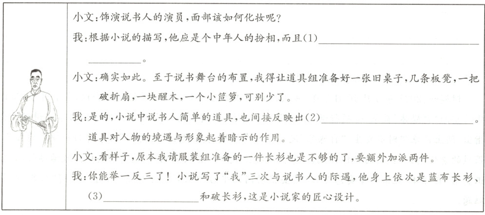 14. “服化道”是指话剧中的服装、化妆、道具,是排戏中须仔细考虑的要素。在阅读小说后,请你提示小文就说书人这个角色在“服化道”方面进行安排。(3分)