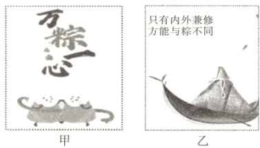 示例一:甲 这幅宣传画中的标语用了“万众一心”的谐音,表示在赛龙舟活动中需要大家团结一心,寓意很好;这幅宣传画中的两个卡通粽子形象手拉手,表示团结合作,一起努力,贴合“赛龙舟”活动,图文结合,融合了两项活动,画面有趣且有深意。