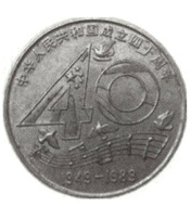 我来解说:中间的“40”和“1949 - 1989”表明这是中华人民共和国成立40周年纪念币,同上面环绕的“中华人民共和国成立四十周年”相呼应;“五星”是国旗的标志,象征着中国共产党领导下的中国人民大团结;“和平鸽”寄寓着中国人民爱好和平的美好愿望;一段五线谱是国歌前奏两小节乐谱,代表中国人民的心声。