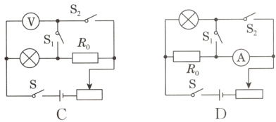 6.小军设计了四种方案来测量小灯泡的额定功率,已知小灯泡的额定电压和定值电阻$R_{0}$的阻值,在电路不能重新拆接的条件下,不能测出小灯泡额定功率的是( )