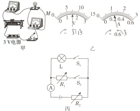 (2)第二个小组发现电流表损坏,用已有的器材、阻值为$5\ \Omega$的$R_0$和另一块电压表,设计了如图丙所示的电路,其中虚线框内的元件组合体相当于________。闭上开关S,移动滑片P,使灯泡两端的电压为________V。再读出$R_0$两端的电压为$1.5\ V$。若实验操作正确,则小灯泡的额定功率为________W。