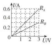 12.定值电阻$R_A$和$R_B$的$I - U$图象如图所示。将两电阻并联在电压为2 V的电路中,通电1 min电阻$R_A$产生的热量为________J;通电相同的时间,$R_A$、$R_B$产生的热量之比$Q_A:Q_B=$________。