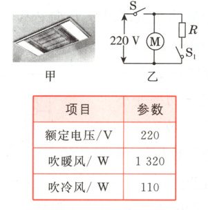 10. (新考法·角度新)一种浴室暖风机如图甲所示,它通过电热丝加热冷空气使室内升温,再利用风扇吹动热空气流动。图乙是该型号浴室暖风机的简化电路图,$R$是电热丝,其阻值不随温度变化。该型号浴室暖风机的主要参数如表所示,问: