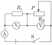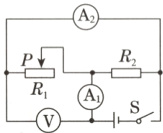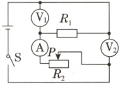 D 【点方法】串联型,“阻大压大流的少,$U_{滑}$、$U_{定}$反着跑”。串联分压法:滑动变阻器滑片$P$向右滑动时,$R_{滑}$变大,则$U_{滑}$($V_{2}$)变大,
