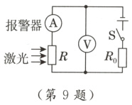 9. 跨学科工程实践如图所示,小明设计了一种烟雾报警装置,R₀的电阻为40Ω,R为光敏电阻,其阻值随激光强度的减弱而增大。当电路中电流小于或等于0.3A时,烟雾报警器报警。开关S闭合后,当电流为0.5A时,R的电功率为4W。下列说法正确的是( )