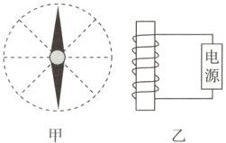 11. [2024·唐山丰润区期末]在物理兴趣小组研学活动中,小聪用名为指南针的手机APP指引方向,如图甲所示,当“小磁针”静止时,其上部指向北方,说明“小磁针”的上部是____(填“N”或“S”)极;小聪将这个APP打开后,放在如图乙所示的电磁体左方,仍呈现如图甲所示的指向,则电源的下部为____(填“正”或“负”)极。