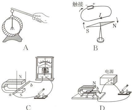 8.[2024·唐山三模]如图所示,小明在微型电扇的插头处连接一个小灯泡,用手快速拨动风扇叶片时,小灯泡发光。下列四幅图中与上述工作原理相同的是 ( )