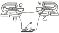 11. 如图,甲、乙两部分装置均由蹄形磁体和导体棒组成,通过开关相连。闭合开关,用外力使导体棒PQ水平向右运动,发现导体棒MN也随之运动起来。则以下判断正确的是 ( )