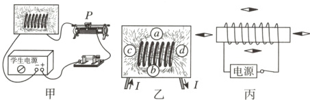 上均匀地洒满铁屑,闭合开关并轻敲玻璃板面,观察到铁屑分布情况如图甲所示,根据铁屑分布情况判定通电螺线管外部的磁场与______磁体的磁场相似。实验时,在小圆位置放置小磁针,如图乙所示,闭合开关,若d处小磁针静止时N极指向右方,则通电螺线管的右端为______极。对调电源正负极,闭合开关,图乙中的小磁针静止时N极指向均发生改变,说明通电螺线管的极性与______的方向有关。