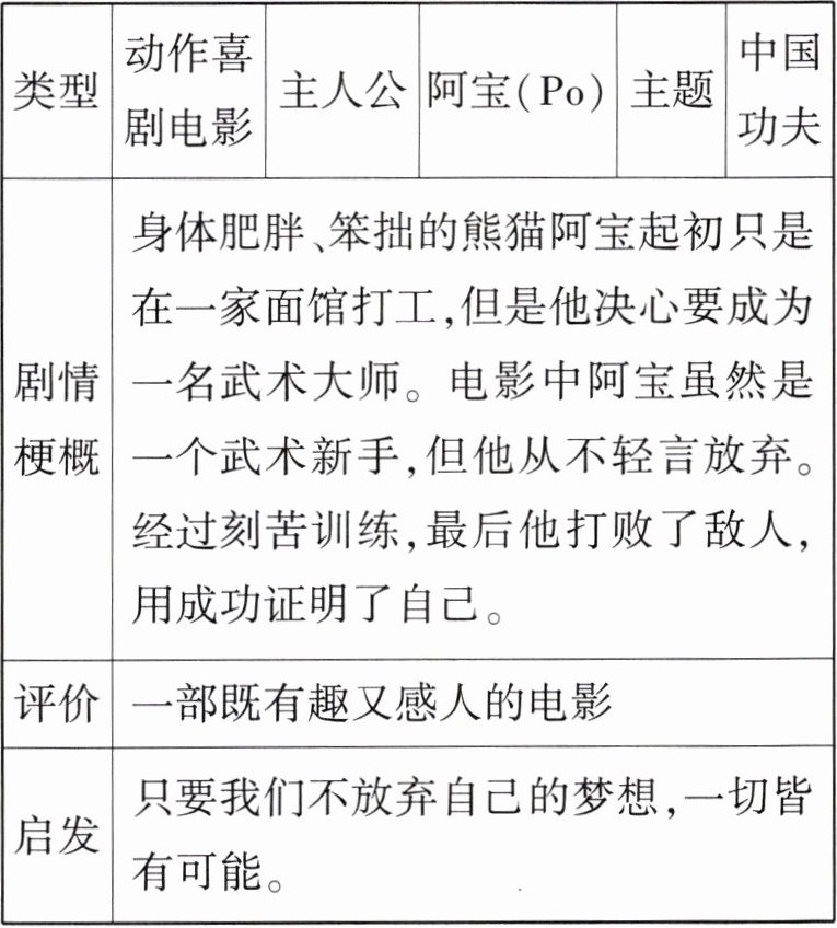 英语课上,老师让大家观看了美国电影《功夫熊猫》(Kung Fu Panda)。请你根据所给提示写一篇英语影评。