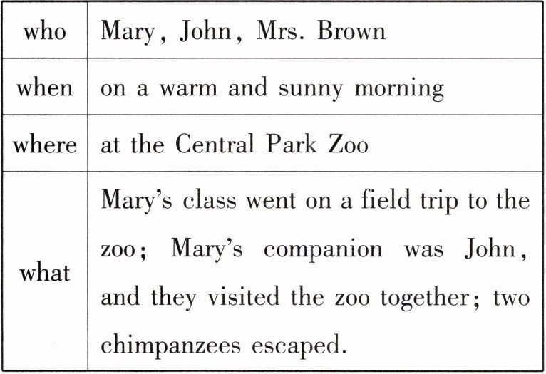 (6)I just wanted to set them free so that they could play outside for a little while! Ⅳ. One possible version: Paragraph 1: As more and more people ran out of the zoo, Mary began to think where John could be. With a mixture of fear and anxiety, Mary left the restaurant to search for her partner. As she looked around the zoo grounds, it occurred to her that John had told her that chimpanzees were his favorite animals. John wouldn't have left the restaurant to release the chimpanzees, would he? Oh no! Mary was sure she knew where John had gone. Paragraph 2: As Mary raced up the path to the animal exhibits, she stopped because she saw John with two chimpanzees held in his arms. He gave Mary a small, guilty smile. "I didn't mean to let them escape," he said. "I just wanted to set them free so that they could play outside for a little while!" he continued with excitement. "I took the key from a zookeeper while he wasn't looking. But then, the exhibit lock broke and..." Luckily, no one got injured and the chimpanzees were sent back by zookeepers. In the end, John realized his mistake and promised that he would behave himself.