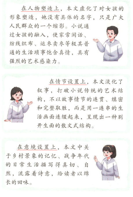 1. ①“我”作为文中的线索人物,由“我”想买布开始,以买布结束,首尾呼应,结构完整。②小说的主题是歌颂八路军和人民群众为了共同的目标,在生死的斗争中建立的亲密关系和深厚情谊。“我”是八路军的代表,“我”和妞儿一家的情谊,就是军民亲密关系的象征。③“我”似是作者的化身。作者常常通过“我”直接抒发对冀中人民深刻的爱和深切的怀念之情,通过“我”的所见、所闻、所感,可以使这种“爱”表达得更鲜明、更充分、更强烈。
