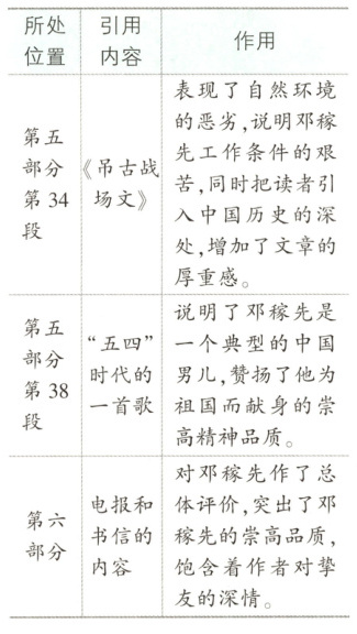 1.[示例]“获得博士学位后立即乘船回国”很令人感动,“立即”一词写出了邓稼先强烈的爱国情怀;“我不能走”一句也特别感人,充分体现了邓稼先身先士卒、勇担风险的崇高精神。这些内容从细节上体现了邓稼先的人格魅力,能体现全文所要表达的思想情感。