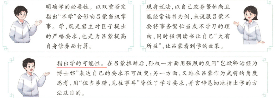 孙权认为学习对执掌军权的吕蒙来说,尤为重要。孙权劝说吕蒙,首先向吕蒙指出学习的必要性:“卿今当涂掌事,不可不学!”当吕蒙“以军中多务”相推辞时,孙权指出学习的目的和方法,而且现身说法,以“卿言多务,敦若孤?”回应了吕蒙的推托,并用自己的体会强调学习的作用。最终,吕蒙无可推辞,“乃始就学”。