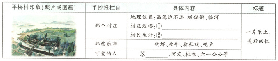《社戏》中,“迅哥儿”在平桥村度过了一个快乐的夏天。假期结束,老师要求大家完成一份关于暑期出行的小报。请你帮助“迅哥儿”完成手抄报的素材积累。