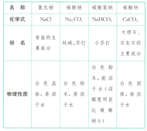 |名称|氯化钠|碳酸钠|碳酸氢钠|碳酸钙|