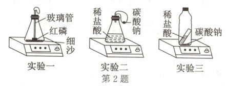 (1)实验一:称量装置和试剂的总质量为$m_1$,使红磷燃烧,待装置冷却后,再次称量装置和试剂的总质量为$m_2$,$m_1$与$m_2$的大小关系是$m_1$________$m_2$。(整个过程中装置密闭性良好)