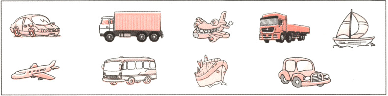 一、(新知导学)下面的交通工具哪些在天上飞?哪些在水中游?哪些在路上开?先分一分,再把结果表示出来。