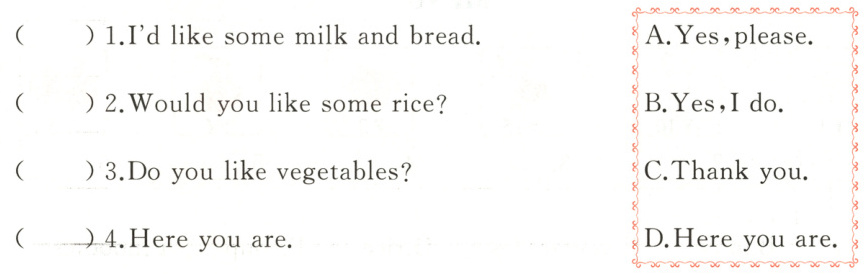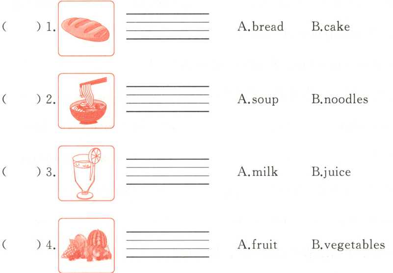 1.A bread 2.B noodles 3.B juice 4.A fruit