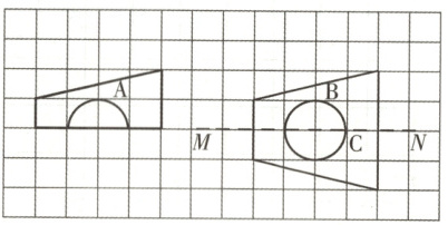 图形A向右平移7格得到图形B。作图形B关于直线MN的轴对称图形得到图形C