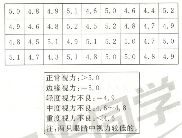 (3)全班( )的人数最多,( )的人数最少。(填视力等级)(2分)