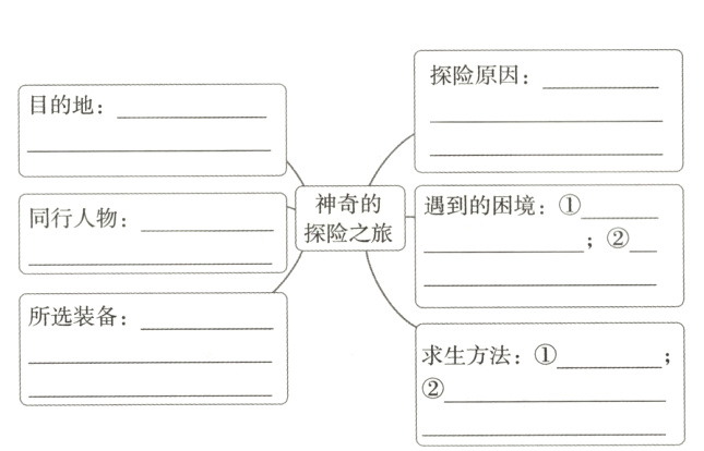 示例:目的地:广袤的沙漠 同行人物:生物学家王叔叔、表哥 所选装备:指南针、地图、饮用水、食品、药品、帐篷、刀具 探险原因:寻找一种具有神奇生命力的千年古树——胡杨 遇到的困境:①无火做饭 ②饮用水紧缺 求生方法:①钻木取火 ②借助指南针和地图找到一块绿洲