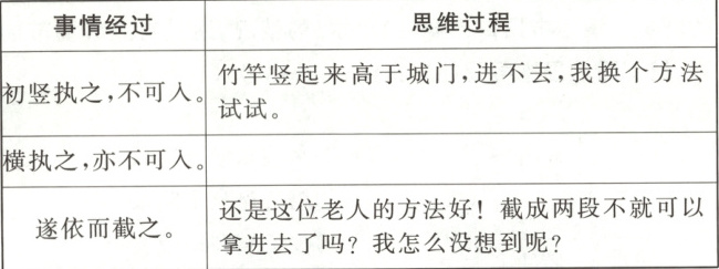 鲁①有执长竿入城门者,初竖执之,不可入。横执之,亦不可入。计无所出②。俄③有老父④至,曰:“吾非圣人,但见事多矣!何不以锯中截⑤而入?”遂依而截之。