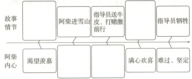 ⑥指导员拍拍阿柴的肩膀说:“我要跟你打个赌。我们来比一比谁先翻过雪山,你肯定比不过我。”阿柴说:“那可不一定,我行军速度可快了!”“要是你比我先翻过雪山,我的军帽送给你!”指导员认真地说。阿柴的眼睛亮了,二话不说,拉起木棍,迈开大步在齐膝深的大雪中走了起来。虽然又冷又饿,可一想到自己梦寐以求的军帽,他就觉得浑身充满了力量!