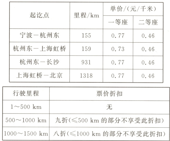 (1)宁波的王医生临时有事要坐高铁去上海,途经杭州东,因车票紧张,二等座已售罄,买了一张一等座,花了多少元? (取整数)(3分)