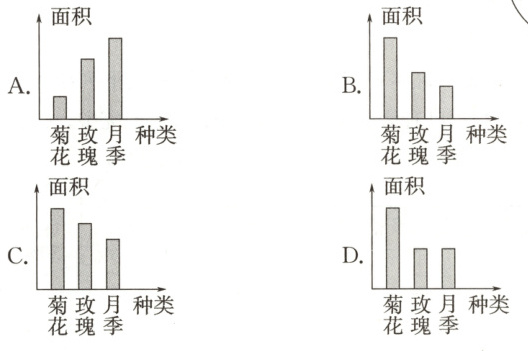 3. 一个圆形花坛内种了三种花,右图是这三种花的种植面积的情况统计图。下面用条形统计图表示这三种花的种植面积正确的是( )。