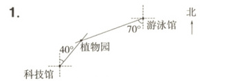 1.在一张城市地图上,有科技馆、游泳馆和植物园三个地方,但植物园的具体位置不清楚,只知道植物园在科技馆北偏东40°方向上,在游泳馆南偏西70°方向上。你能确定植物园的位置吗?画一画。(4分)