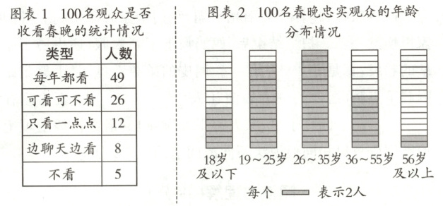 (4)× 17.示例:不赞同。从图表1和图表2可以看出100名观众中,有近一半的人观看春晚,这说明人们对传统节日还是很重视的,所以不能说“传统节日已经过时了”。