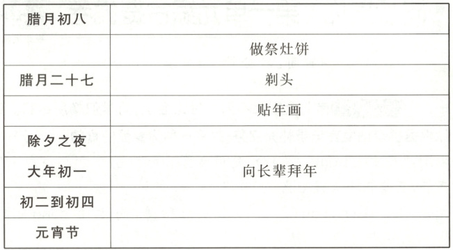 2. 本文在写作时使用了详略结合的手法,其中详写了春节期间________、________、________这三天农家过年的情形,略写了其他几天的情形。这样安排有什么好处呢?(4分)