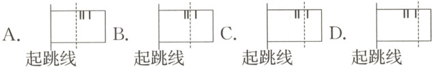3. (海淀真题)体育老师用示意图表示了明明跳远的情况,如右图,图中三条短实线所在的位置代表他三次跳远的成绩。如果用虚线所在的位置表示他三次跳远的平均成绩,下面示意图中正确的是( )。