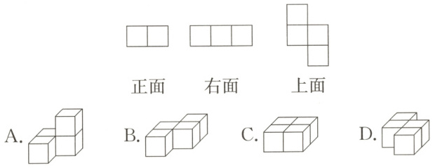 6. 乐乐用完全相同的小正方体搭了一个立体图形,从正面、右面和上面看到的形状如下,他搭的图形是( )。