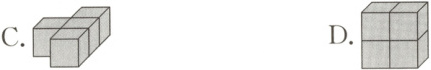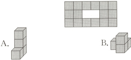 4. (湛江真题)田田搭了四个立体图形,如图所示,图( )不能从下图的空隙中穿过去(下图中的正方形边长与每个小方块的棱长相同)。