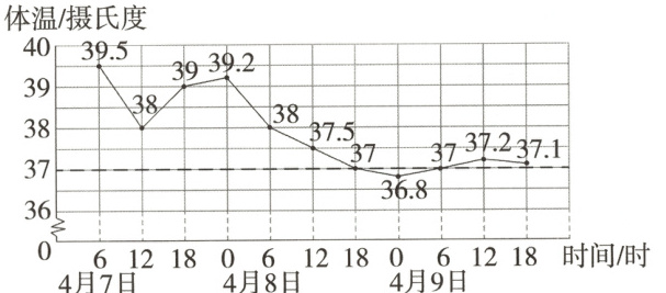 (2)他在4月8日12时的体温是( )摄氏度;他的体温在( )月( )日( )时下降最快,( )月( )日( )时比较稳定。