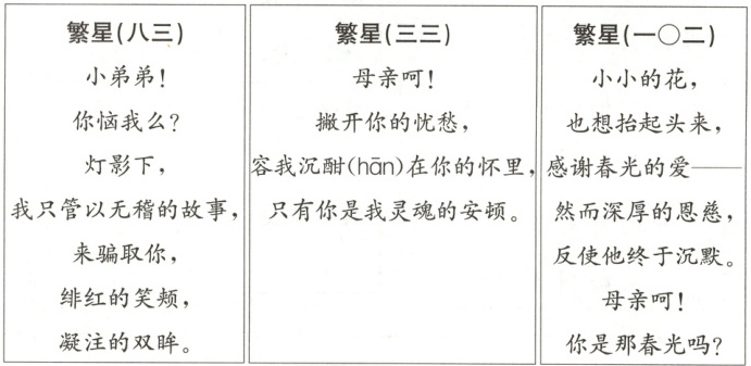 小光特别喜欢诗歌集里收录的冰心《繁星》里的三首小诗。请你读一读,感受诗歌蕴含的感情吧!