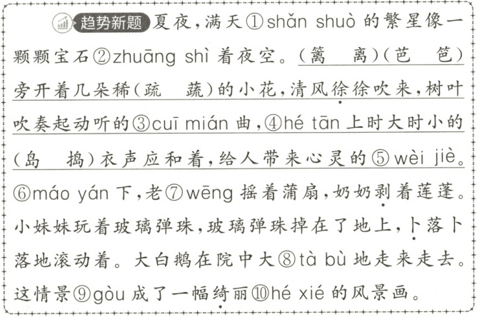 3.①闪烁 ②装饰 ③催眠 ④河滩 ⑤慰藉 ⑥茅檐 ⑦翁 ⑧踏步 ⑨构 ⑩和谐